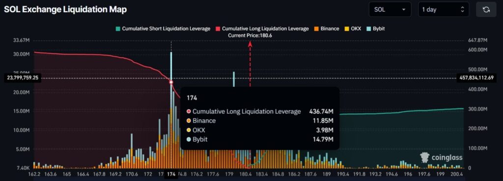 حجم لیکوییدیشن پوزیشنهای لانگ با ۴۳۶.۷۴ میلیون دلار، بهمراتب بیشتر از لیکوییدیشن پوزیشنهای شورت با ۲۳.۷۹ میلیون دلار بوده که بیانگر غلبه نسبی خریداران است. با این حال، همین دادهها تأکید میکنند که عبور از سطح ۱۸۴ دلار یک نقطه تعیینکننده خواهد بود.