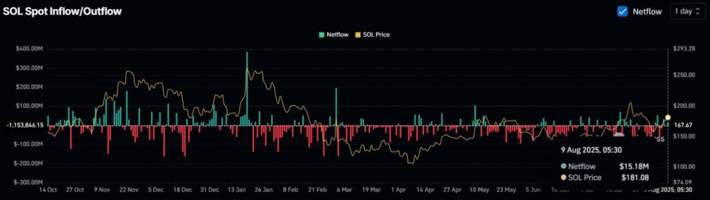 بر اساس آمار کوینگلس (CoinGlass)، حدود ۱۵.۱۸ میلیون دلار ورودی به صرافیها در روز ۹ آگوست ثبت شد؛ این اتفاق در جریان روندهای صعودی معمولاً نشانهای از آمادگی برخی سرمایهگذاران برای فروش در قیمتهای بالاتر است.