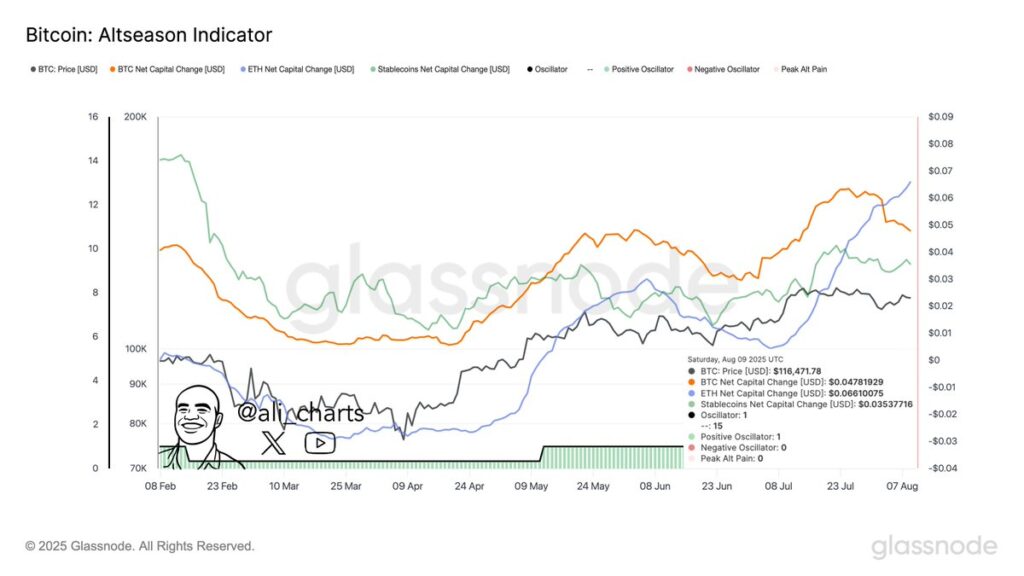 علی مارتینز (Ali Martinez) – تحلیلگر بازار کریپتو – نیز گزارش داده که تغییر خالص سرمایه ورودی به اتریوم از بیت کوین فراتر رفته است و این را روشنترین نشانه آغاز فصل آلت سیزن دانسته است. تحلیلگران بر این باورند که با شدت گرفتن این فصل، جریان سرمایه بیشتری از بیت کوین به سمت اتریوم منتقل خواهد شد.