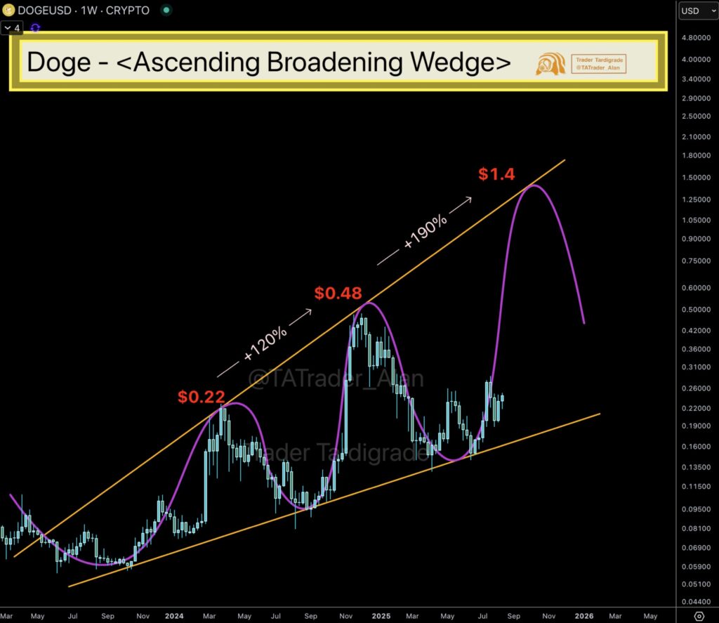 تریدر تاردیگرید (Trader Tardigrade) – تحلیلگر مشهور – در پلتفرم X توییتی منتشر و به شکلگیری یک الگوی کنج پهنشونده صعودی (Increasing Broadening Wedge) در نمودار هفتگی قیمت دوج کوین اشاره کرده است. این ساختار معمولاً از کفها و سقفهای بالاتر متوالی تشکیل میشود. دادههای تاریخی نشان میدهد که در چرخههای پیشین، این الگو بازدهیهای بیش از ۱۲۰٪ بین ۰.۲۲ تا ۰.۴۸ دلار و همچنین رشدی بالاتر از ۱۹۰٪ تا سطح ۰.۷۷ دلار ایجاد کرده است.