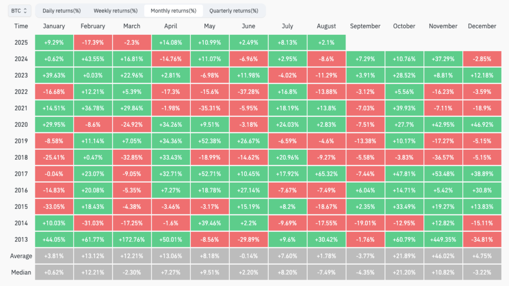 دادههای کوینگلس (CoinGlass) نیز نشان میدهد که بیت کوین در ماه آگوست امسال تاکنون ۲.۱٪ رشد داشته که کمی بالاتر از میانگین تاریخی ۱.۸٪ است؛ در حالی که سپتامبر بهطور میانگین معمولاً با ۳.۸٪ افت همراه بوده است.