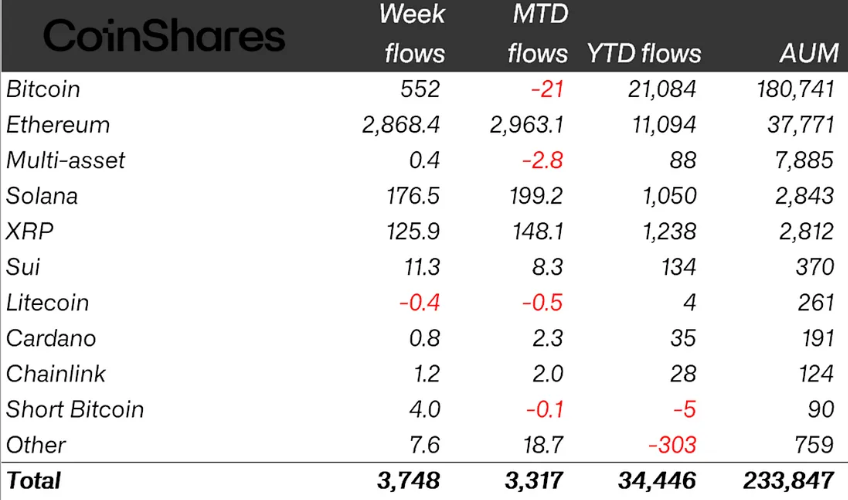 به گزارش میهن بلاکچین و بر اساس گزارشی که شرکت کوینشرز (CoinShares) امروز منتشر کرده، محصولات ETP ارزهای دیجیتال در سطح جهان طی هفته منتهی به جمعه در مجموع ۳.۷۵ میلیارد دلار سرمایه جذب کردند.