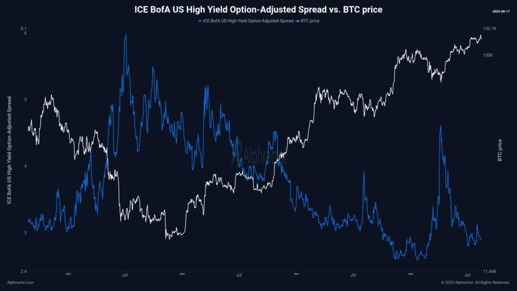 به گزارش مهین بلاکچین، ژوائو ودسون (Joao Wedson) – بنیانگذار آلفرکتال (Alphractal) – یکی از قابلاعتمادترین شاخصهایی که باید زیر نظر گرفت OAS است. این شاخص تفاوت بازده اوراق قرضه شرکتی پرریسک با اوراق خزانهداری آمریکا را اندازهگیری میکند.