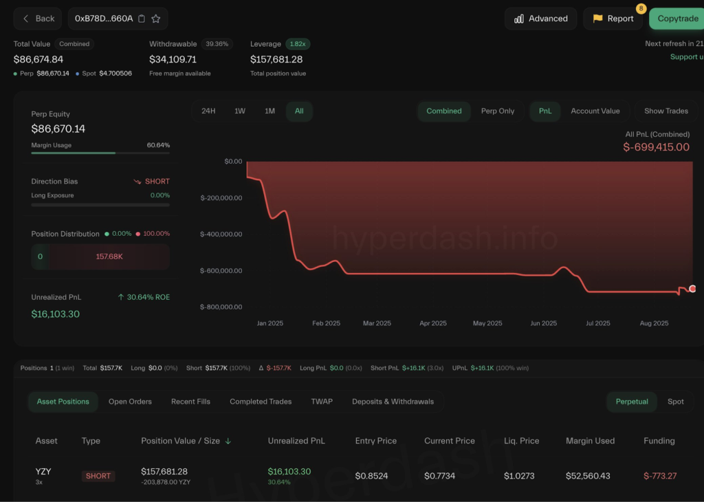 به گزارش میهن بلاکچین، دادههای آنچین نشان میدهد که آدرس کیف پول منتسب به تیت یک پوزیشن شورت سهبرابری روی توکن YZY با قیمت ۰.۸۵ دلار باز کرده اما تا به اینجای کار در ضرر بیش از ۱۶ هزار دلاری قرار گرفته است.