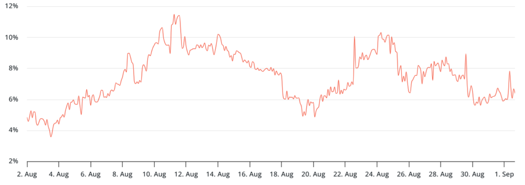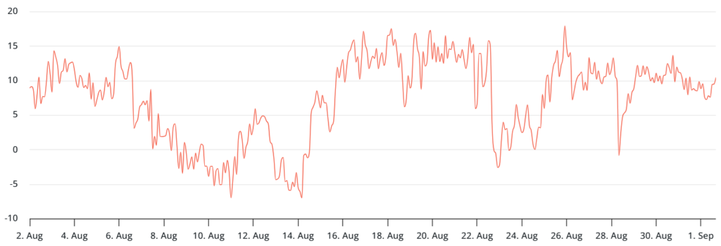 پریمیوم سالانه قراردادهای آتی ماهانه بیت کوین در حال حاضر روی ۷٪ قرار دارد که بهطور قطعی در محدوده خنثی ۵٪ تا ۱۰٪ بوده و نسبت به هفته گذشته ثابت مانده است. این شاخص آخرین بار در ۲۴ آگوست (۲ شهریور) پس از آنکه رشد قیمت تا ۱۱۷٬۰۰۰ دلار در پی سخنرانی جروم پاول، رئیس فدرال رزرو آمریکا، امیدها را برای سیاست پولی کمتر محدودکننده افزایش داد، نشانههای صعودی نشان داد.