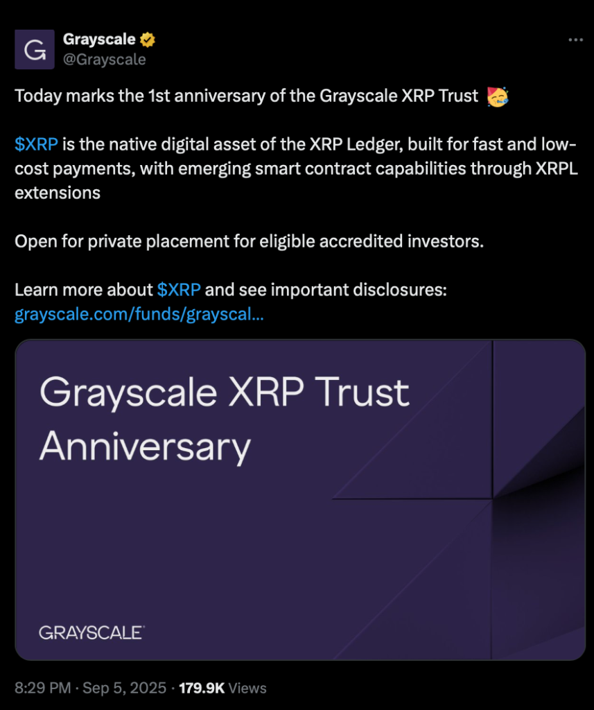 در سپتامبر ۲۰۲۵، اولین سالگرد صندوق ایکس.آر.پی تراست (XRP Trust)، یکی از محبوبترین صندوقهای تراست شرکت گریاسکیل (Grayscale) که هنوز به صندوق قابل معامله در بورس (ETF) اسپات تبدیل نشده است، فرا رسید.
