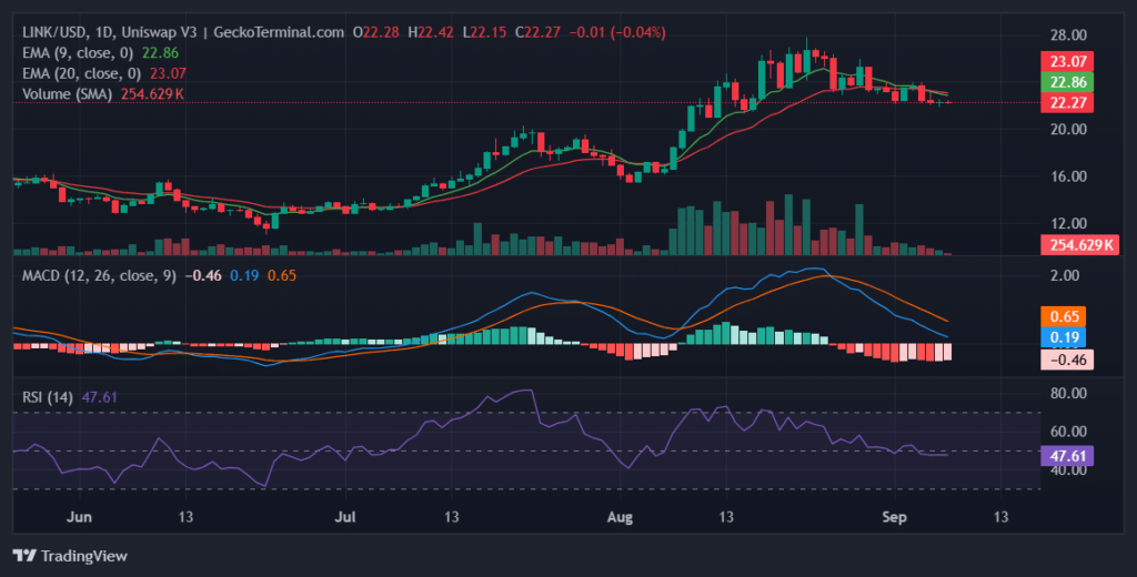 اخیراً چین لینک تلاش کرد سطح EMA 9 را بشکند، اما این حرکت پایدار نماند؛ این موضوع نشانهای از آن است که خریداران هنوز کنترل کامل بازار را به دست نگرفتهاند. نزدیکی این دو میانگین به قیمت فعلی هم حاکی از بازاری است که به دنبال جهت مشخص میگردد.