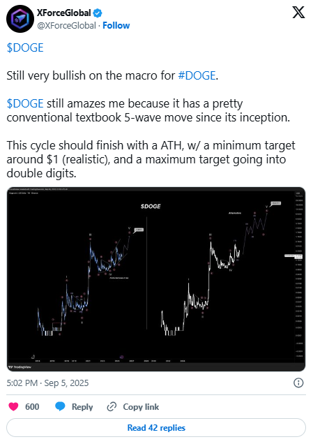 اکسفورسگلوبال (XForceGlobal)، تحلیلگر معروف نیز مدعی شده که قیمت دوج کوین در این چرخه میتواند به ۱ دلار برسد. البته وی میگوید بر اساس تحلیل امواج الیوت احتمال جهش قیمت دوج کوین تا ۱۰ دلار نیز وجود دارد!