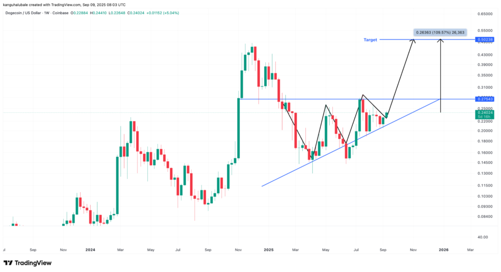 تحلیلهای تکنیکال نشان میدهد که دوج کوین در موقعیت خوبی برای یک جهش قیمتی قرار گرفته است. در نمودار هفتگی، قیمت این ارز دیجیتال در داخل یک الگوی مثلثی صعودی در حال نوسان است و خریداران اکنون بر عبور از خط مقاومت ۰.۲۷ دلاری تمرکز کردهاند.