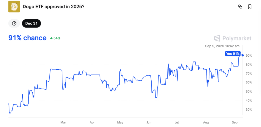 بر اساس پیشبینی سرمایهگذاران در پلتفرم پالیمارکت، ۹۱٪ احتمال میرود که ETF اسپات دوج کوین در سال ۲۰۲۵ تایید و راهاندازی شود.