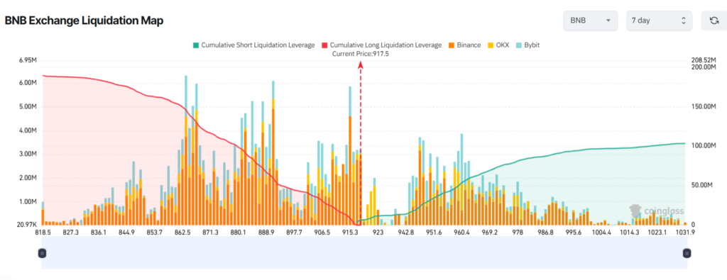 با این حال، مشابه وضعیت اتریوم، نقشه لیکوئیدیشن BNB در بازه هفتروزه نشاندهنده تمرکز بیشتر روی پوزیشنهای لانگ است. اگر قیمت بیانبی این هفته به ۸۱۸ دلار برسد، بیش از ۱۸۹ میلیون دلار موقعیت لانگ لیکوئید خواهد شد. در مقابل، صعود به ۱۰۳۱ دلار میتواند بیش از ۱۰۳ میلیون دلار پوزیشن شورت را از بین ببرد.