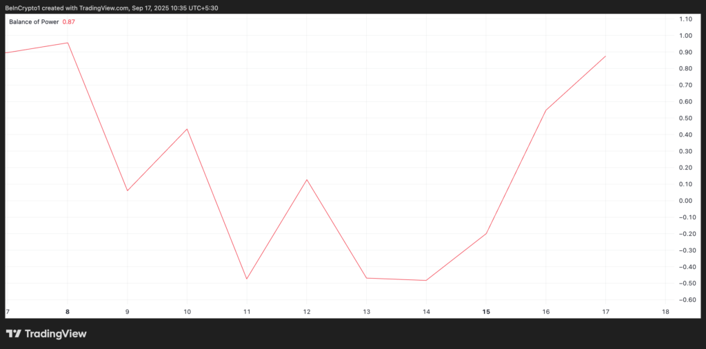 رشد دو رقمی MYX در ۲۴ ساعت گذشته با پشتوانه تقاضای قابل توجه بازار همراه بوده است. شاخص قدرت توازن (Balance of Power یا همان BoP) که فشار خرید و فروش را میسنجد، هماکنون روی عدد ۰.۸۷ قرار دارد و روندی صعودی را نشان میدهد؛ این موضوع به وضوح حاکی از افزایش فشار خرید و تسلط خریداران بر روند قیمتی است.
