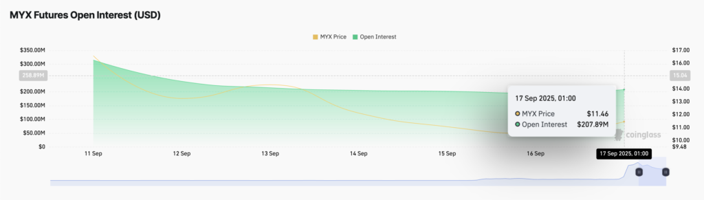 همزمان با رشد قیمت، علاقه معاملهگران به بازار مشتقات MYX نیز افزایش یافته است. طبق دادههای کوینگلس (Coinglass)، سود باز این توکن در بازار آتی به ۲۰۸ میلیون دلار رسیده که نسبت به روز گذشته ۶٪ رشد داشته است.