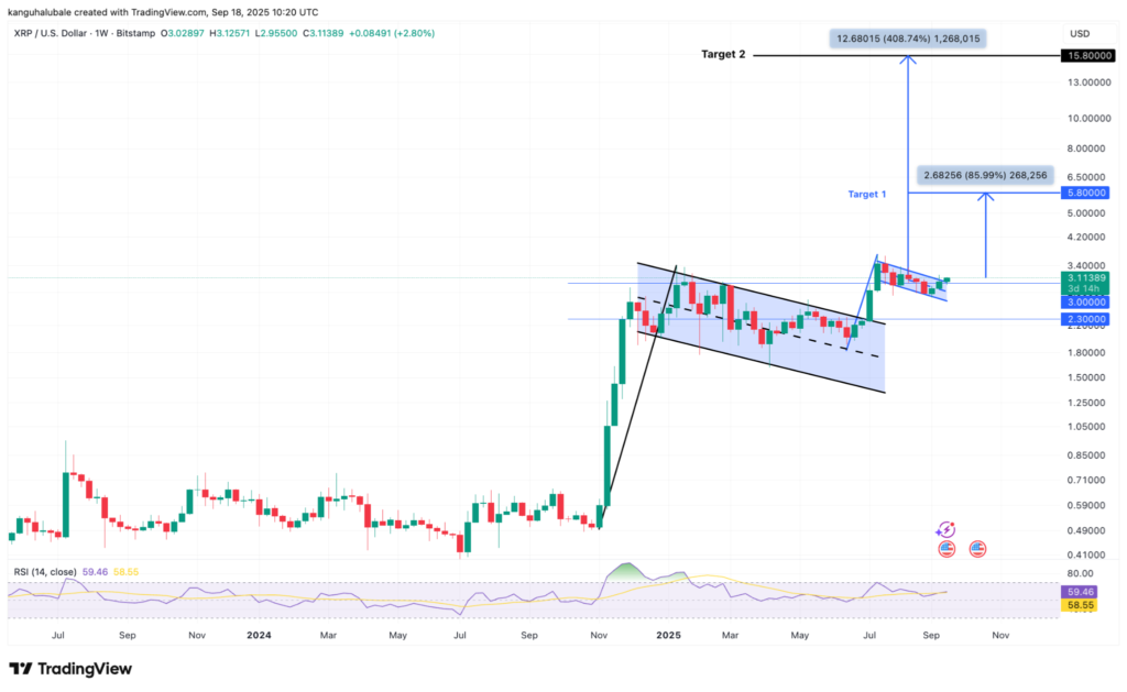 اما جذابتر از این، الگوی دوم و بزرگتری است که از نوامبر ۲۰۲۴ در حال شکلگیری است. این الگو با جهش قیمت ریپل در ماه جولای و رسیدن به اوج ۹ ساله ۳.۶۶ دلار تأیید شد و حالا میتواند مسیر را برای یک صعود چشمگیر تا محدوده ۱۵.۸۰ دلار باز کند.