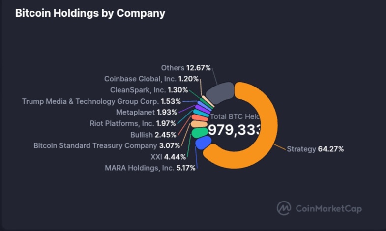 دادههای تازه نشان میدهد که از زمان گزارش کریپتوکوانت، مجموع ذخایر BTC شرکتهای سهامی عام به بیش از ۱,۰۱۱,۳۸۷ واحد (معادل ۱۱۸ میلیارد دلار) رسیده است. این مقدار حدود ۵٪ از کل عرضه بیت کوین را تشکیل میدهد.