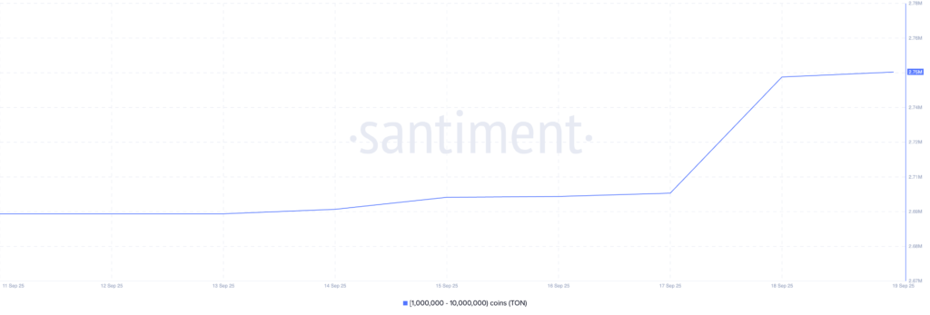 دادههای سنتیمنت نشان میدهد که آدرسهایی که بین یک تا ۱۰ میلیون توکن TON نگهداری میکنند، طی هفته سوم سپتامبر ۵٪ به داراییهای خود اضافه کردهاند.