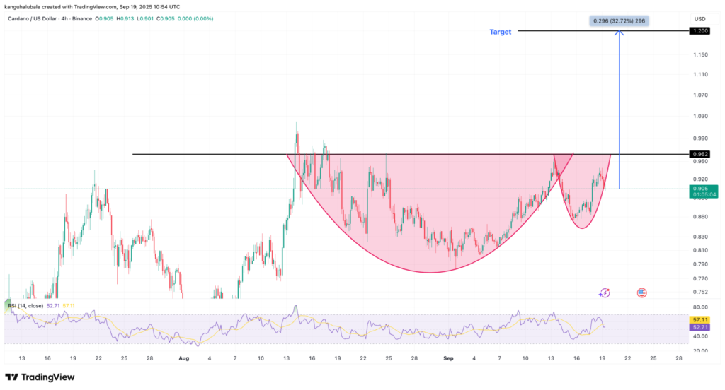 الگوی فنجان و دسته در نمودار ۴ ساعته کاردانو – منبع: TradingView