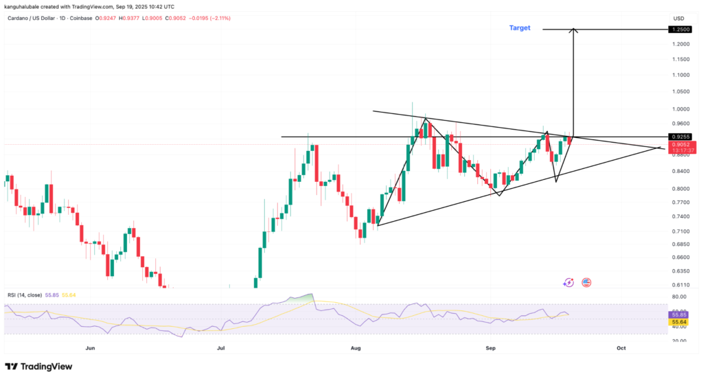 الگوی مثلث متقارن در نمودار روزانه ADA – منبع: TradingView