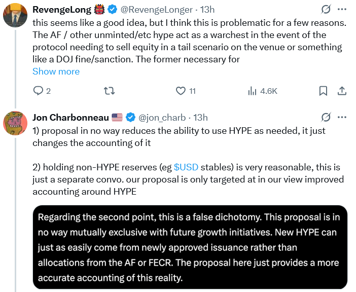 شاربونو توضیح داد که شاخص حجم بازار کاملا رقیقشده (FDV) باعث میشود حتی توکنهای ضربنشده هم در ارزشگذاری لحاظ شوند و همین مسئله بهنوعی سرمایهگذاران را دلسرد میکند. به اعتقاد او، این تغییر میتواند علاوه بر جذابتر کردن HYPE برای سرمایهگذاران و استیککنندگان، همچنان امکان تأمین مالی پروژه از طریق انتشارهای جدید را حفظ کند. در صورت تصویب، بیش از ۴۲۱ میلیون توکن از محل انتشارهای آتی و پاداشها و ۲۱ میلیون دیگر از صندوق پشتیبانی حذف خواهد شد.