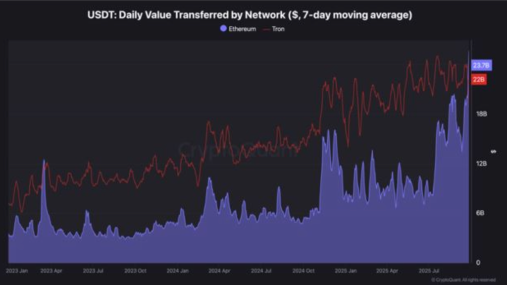 طبق دادههای جدید، در حالی که ترون در هفته گذشته حدود ۲۲ میلیارد دلار از نقل و انتقالات USDT را تحت سلطه داشت، اتریوم توانست ۲۳.۷ میلیارد دلار را جابهجا کند. این رقابت فشرده باعث تغییراتی در دینامیک بازار شده است. به لطف تقاضای بیشتر از سوی نهادهای مالی و سرمایهگذاران نهادی، به نظر میرسد که اتریوم توانسته است برتری خود را به دست آورد.