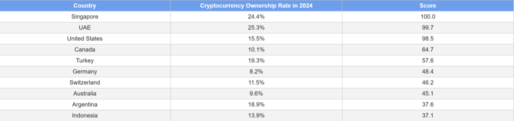 در این گزارش سنگاپور با امتیاز کامل ۱۰۰ در رتبه نخست جهان قرار گرفته و با نرخ مالکیت ۲۴.۴ درصدی، یکی از بالاترین سطوح مشارکت عمومی در جهان را ثبت کرده است. علاوه بر این این کشور رکورددار حجم جستوجوی آنلاین در حوزه رمزارزهاست و به طور میانگین از هر ۱۰۰ هزار نفر، ۲ هزار جستوجوی مرتبط با کریپتو انجام میشود.