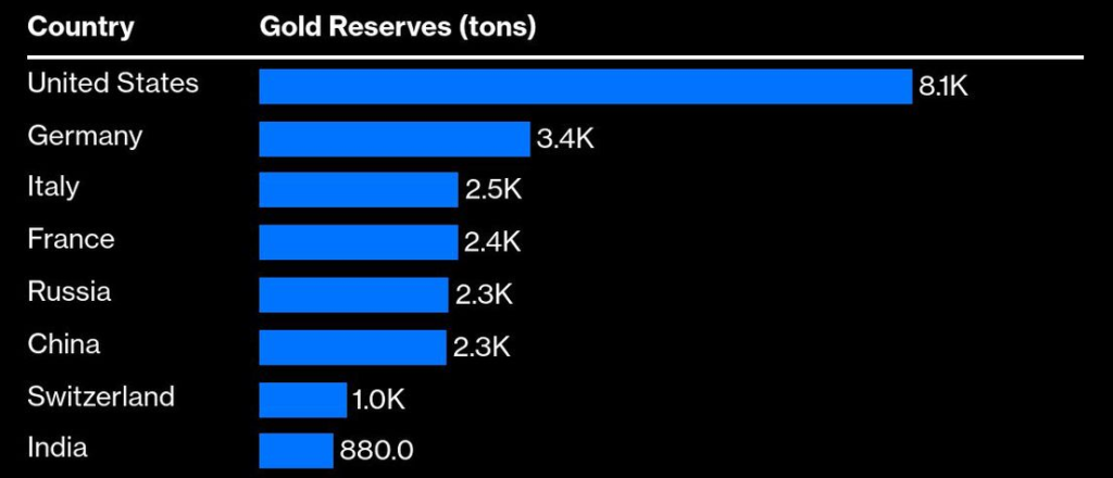 جدول کشورهایی با بیشترین ذخایر طلا. منبع: بلومبرگ