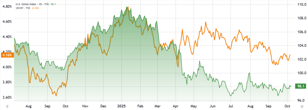 بازدهی اوراق ۱۰ ساله خزانهداری آمریکا (نارنجی) در مقایسه با شاخص دلار (DXY) – منبع: TradingView