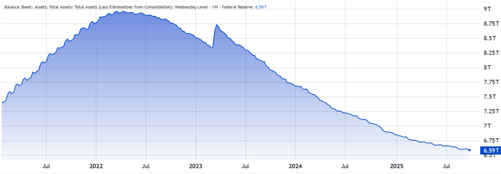 در مقابل، امروز فدرال رزرو نهتنها برنامهای برای کاهش ترازنامه ندارد، بلکه به دلیل وجود نشانههای ضعف در بازار کار احتمالاً مسیر انبساطی خود را ادامه خواهد داد؛ این موضوع فضای لازم برای تداوم رشد داراییهای پرریسک را فراهم میکند.