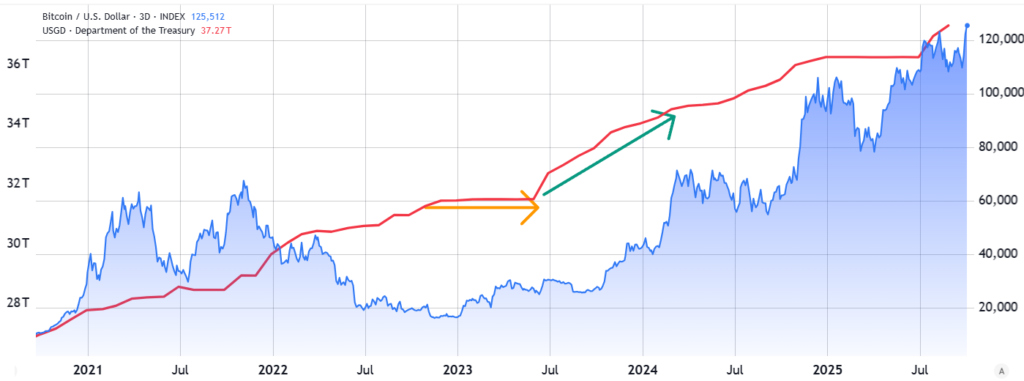 روند بدهی دولت آمریکا (قرمز) در برابر قیمت بیت کوین (آبی) – منبع: TradingView