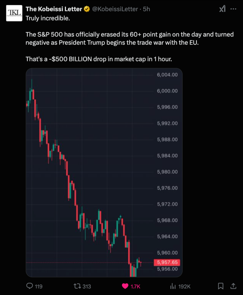 علاوه بر ضعف در بازار کریپتو که تقریباً یک هفته است ادامه دارد، بازارهای سهام ایالات متحده نیز با کاهش همراه شدند. شاخص S&P 500 پس از آنکه دونالد ترامپ، رئیسجمهور آمریکا، وعده داد که تعرفه ۲۵٪ علیه اتحادیه اروپا اعمال خواهد کرد، با افت مواجه شد.