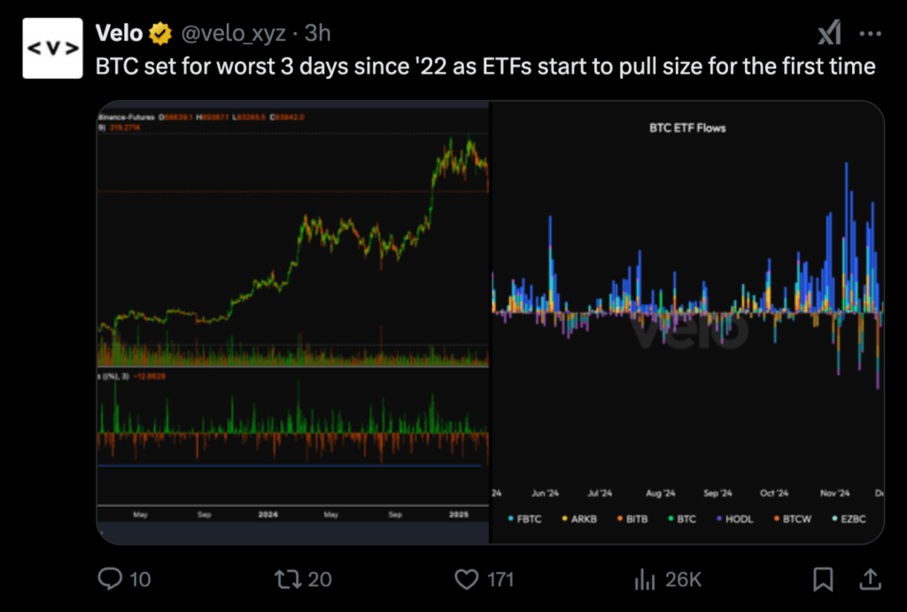 دادههای ولُو (Velo) نشان میدهد که بیت کوین بدترین عملکرد سهروزه خود از سال ۲۰۲۲ تاکنون را تجربه کرده است. این منبع تحلیلی همچنین به خروج میلیاردها دلار سرمایه از ETFهای اسپات بیت کوین اشاره کرده است.