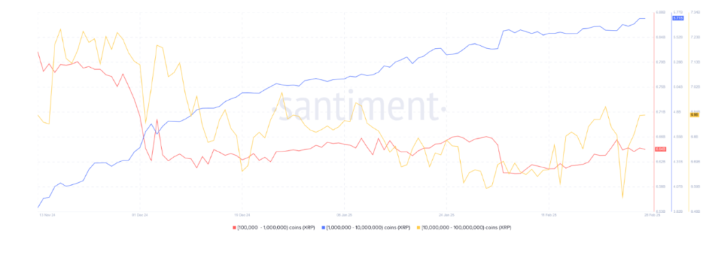 - در هفتههای اخیر نیز چنین رفتاری مشاهده شده و دادههای آنچین نشان میدهد که آدرسهایی با ۱ تا ۱۰ میلیون XRP و ۱۰ تا ۱۰۰ میلیون XRP از تاریخ ۲۴ فوریه (۶ اسفند) بهطور قابلتوجهی داراییهای خود را افزایش دادهاند.