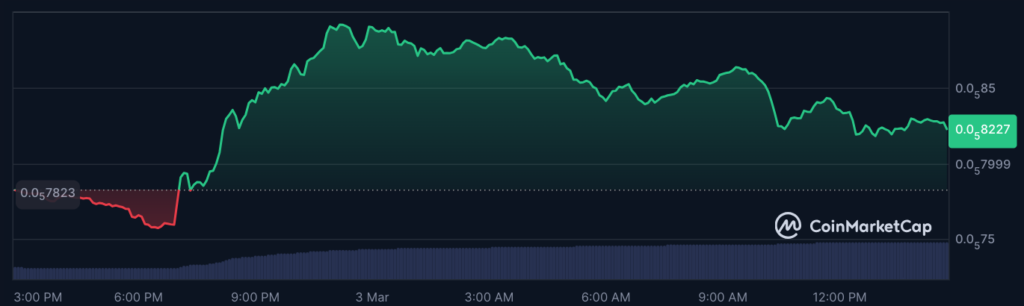 با وجود فروش گسترده این نهنگ، قیمت خرید پپه در بازار ارزهای دیجیتال در طول ۲۴ ساعت گذشته ۵.۸۶٪ افزایش یافته و به ۰.۰۰۰۰۰۸۲۶۵ دلار رسید.