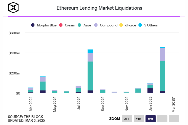 فوریه شاهد یکی از بزرگترین رویدادهای لیکویید شدن در بازارهای وامدهی اتریوم در ۱۲ ماه گذشته بود، به طوری که نزدیک به نیم میلیارد دلار وثیقه لیکویید شد.