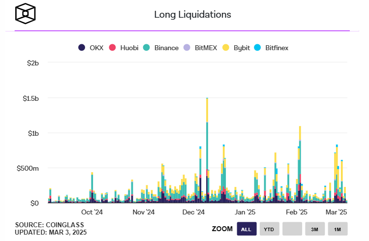 با کاهش قیمت بیت کوین و اتریوم به ترتیب بیش از ۱۸٪ و ۲۶٪ در پایینترین سطوح خود، صرافی بایبیت (Bybit) شاهد رکوردی جدید در حجم لیکوییدیشنهای پوزیشنهای لانگ بود. در مجموع، بیش از ۱.۴ میلیارد دلار لیکوییدی لانگ در طول هفته ثبت شد. از این مقدار، بزرگترین رقم ثبتشده در یک روز مربوط به ۲۵ فوریه ۲۰۲۵ (۷ اسفند) بود که بیش از ۳۸۳ میلیون دلار موقعیت لانگ لیکویید شد. این رویداد، بالاترین میزان لیکویید شدن روزانه و هفتگی در تاریخ بایبیت محسوب میشود.