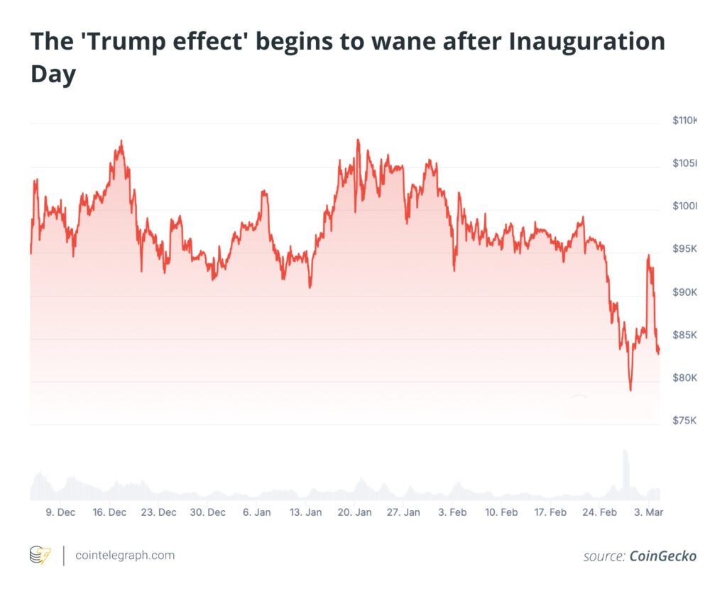 بسیاری از فعالان بازار کریپتو باور داشتند که پیروزی دونالد ترامپ در انتخابات ریاستجمهوری آمریکا باعث افزایش چشمگیر قیمت بیت کوین خواهد شد، و این اتفاق هم افتاد. قیمت بیت کوین در روز انتخابات (۵ نوامبر) حدود ۶۹,۳۷۴ دلار بود، اما تا ۲۰ ژانویه که دولت جدید رسما روی کار آمد، به رکورد ۱۰۸,۷۸۶ دلار رسید. از آن زمان اما بازار مسیر نزولی را در پیش گرفته به طوری که بیت کوین در تاریخ ۲۸ فوریه به زیر ۸۰ هزار دلار سقوط کرد و از اوج خود ۲۶٪ فاصله گرفت.