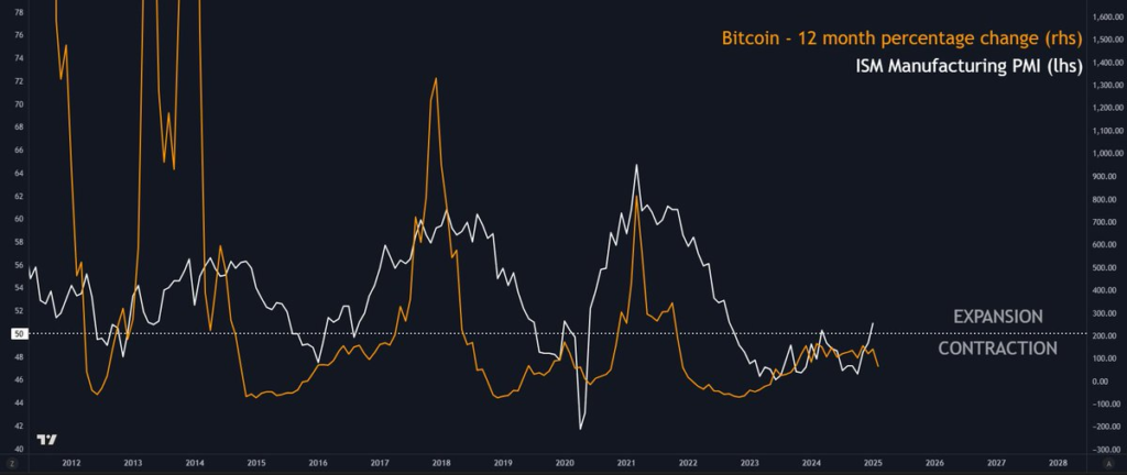 اما نهتنها سهام، بلکه تقریباً تمام داراییهای پرریسک، از جمله بیت کوین، به شدت با PMI همبسته هستند. به گفته توماس آن مارکتس (TomasOnMarkets) تحلیلگر کلان:
