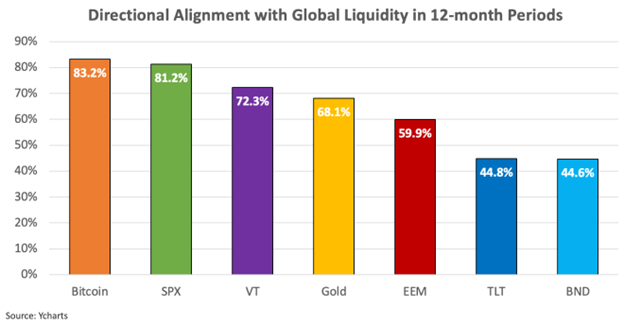 بیت کوین در ۸۳٪ مواقع در یک بازه ۱۲ ماهه، همجهت با نقدینگی جهانی حرکت میکند که این رقم، بالاتر از تمام کلاسهای دارایی دیگر است و آن را به شاخصی قوی برای شرایط نقدینگی تبدیل میکند.