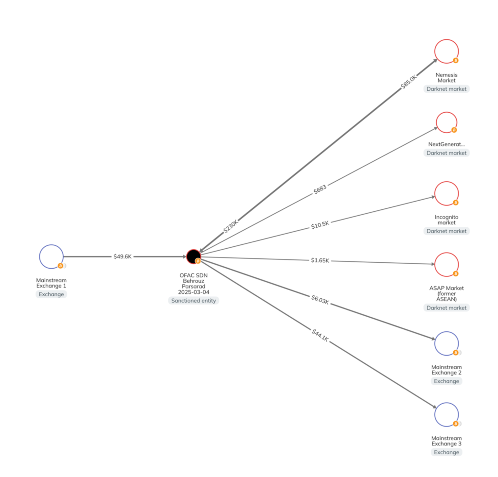 آدرسهای تحریمشده مرتبط با پارساراد به طور مستقیم با چندین صرافی بزرگ و بازارهای دارکنت در ارتباط هستند.
