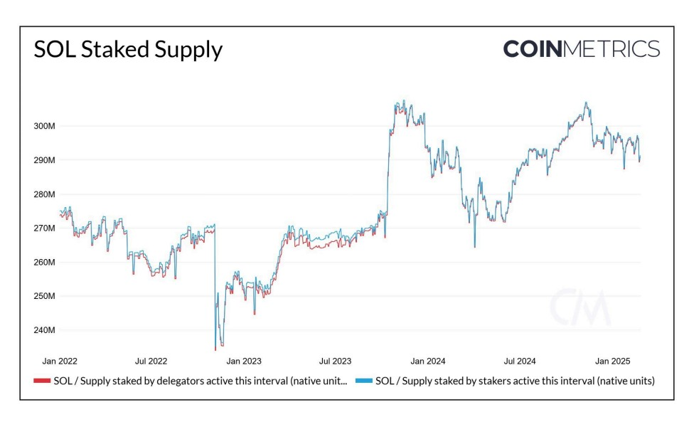از سال ۲۰۲۳، مقدار کوین SOL که در شبکه سولانا استیک شده، افزایش یافته است – منبع: کوین متریکس