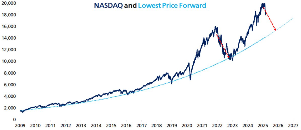 طبق مدل قیمت پیشرو نزدک که توسط پترسون ارائه شده است، اصلاح بازار حدود هفت ماه طول میکشد و شاخص نزدک طی این مدت ۱۷٪ کاهش خواهد یافت. او برای پیشبینی کاهش قیمت بیت کوین، از ضریب ۱.۹ برابر استفاده کرده و نتیجه گرفته که بیت کوین ممکن است ۳۳٪ کاهش یابد و از سطح ۸۶,۱۹۹ دلار در زمان انتشار تحلیلش، به ۵۷,۰۰۰ دلار برسد.