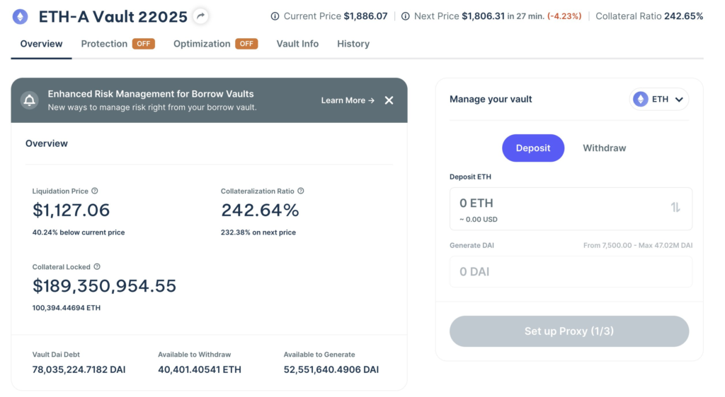 در حال حاضر این کیف پول ۱۰۰٬۳۹۴ اتریوم به ارزش ۱۸۲ میلیون دلار در میکر دارد و قیمت لیکوییدیشن آن ۱٬۱۲۷٬۰۶ دلار شده است.