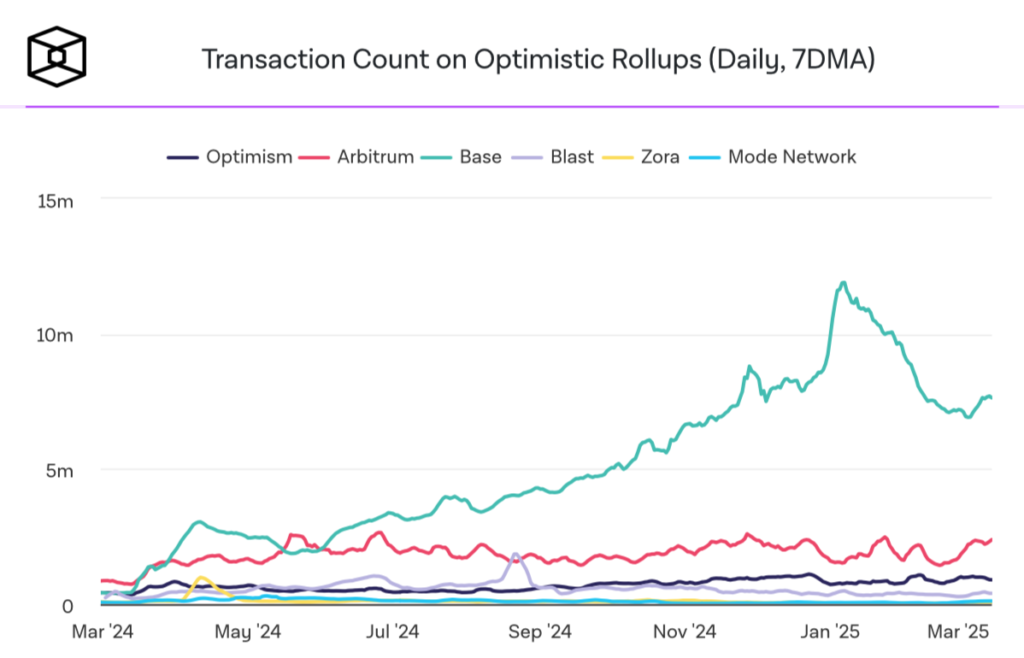 فعالیت تراکنشها در شبکه بیس (Base) نسبت به اوج خود در ماه ژانویه کاهش یافته و میانگین متحرک ۷ روزه تراکنشها از حدود ۱۲ میلیون در ۶ ژانویه (۱ فروردین)، در زمان نگارش مطلب به حدود ۷.۵ میلیون رسیده است.