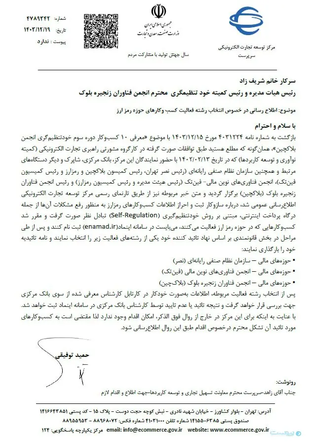 پاسخ مرکز توسعه تجارت الکترونیکی به انجمن بلاکچین در مورد اینماد کسبوکارهای رمزارزی