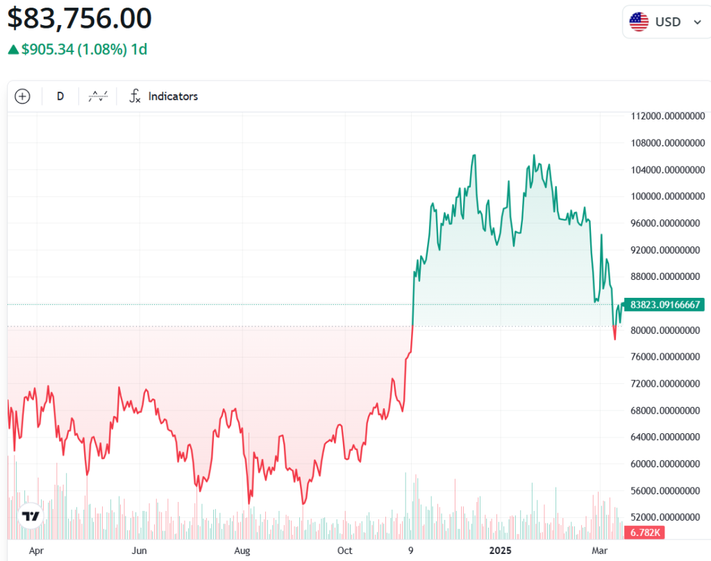 نمودار ۱ ساله قیمت بیت کوین – منبع: TradingView