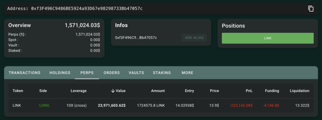 بر اساس این پست، این نهنگ ظاهرا روز گذشته یک پوزیشن لانگ ۳۱ هزار دلاری با اهرم ۱۰ برابری روی چین لینک در دو پلتفرم هایپرلیکویید و جیامایکس (GMX) باز کرده و همچنین ۸۶۳,۱۷۴ توکن LINK را با استفاده از ۱۲.۱ میلیون دلار از استیبل کوین USDC در بازار اسپات خریداری کرده است.