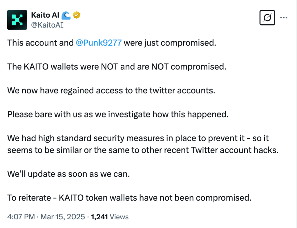 پلتفرم هوش مصنوعی کایتو (Kaito AI) که دادههای کریپتو را تجمیع کرده و تحلیلهای بازار را در اختیار کاربران قرار میدهد، همراه با بنیانگذار آن یو هو (Yu Hu)، در تاریخ ۱۵ مارس (۲۵ اسفند) قربانی یک حمله هکری در شبکه اجتماعی X شدند.