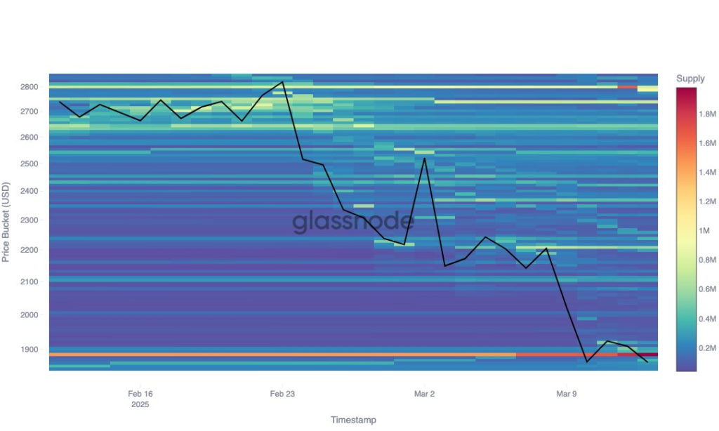گلسنود در پستی در پلتفرم X در تاریخ ۱۴ مارس (۲۴ اسفند)، تحلیلی جالب از بازار اتریوم ارائه داد و به یک سطح حمایتی احتمالی اشاره کرد. بر اساس شاخص توزیع قیمت تمامشده (Cost Basis Distribution – CBD)، این تحلیلگران معتقدند که در صورت کاهش بیشتر قیمت، اتریوم احتمالاً به یک منطقه حمایتی قوی در سطح ۱,۸۸۶ دلار برخورد خواهد کرد.