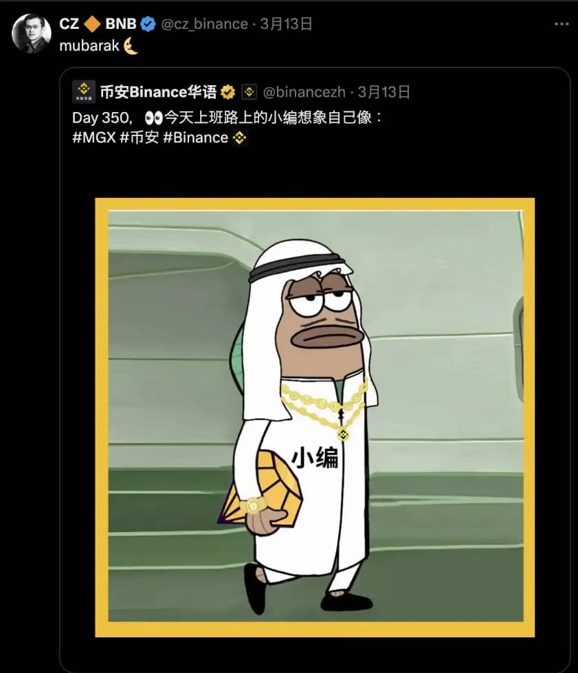 بخش هیجانانگیز ماجرا بعد از ظهر روز بعد زمانی بود که حساب رسمی چینی بایننس در پلتفرم X تصویری از یک «ویرایشگر (Editor)» با مضمون عرب را منتشر کرد. سه ساعت بعد، سی زی (CZ) این پست را با عنوان “Mubarak” بازنشر کرد. در عرض چند دقیقه، پلتفرم Four.meme دهها توکن را با مبارک به عنوان نماد راهاندازی کرد. یک میم کوین که به ‘6f6’ ختم میشود، به سرعت به نقطه اوج ارزش بازار ۱.۵۵ میلیون دلاری رسید و به سرعت به ارزش بازار ۲۳۰٬۰۰۰ دلار کاهش یافت.