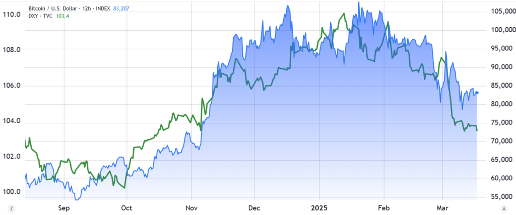 تا اواسط سال ۲۰۲۴، شاخص دلار آمریکا (DXY) رابطهای معکوس با قیمت بیت کوین داشت که یعنی معمولاً با تضعیف دلار، قیمت بیت کوین افزایش مییافت. در آن زمان، بسیاری از سرمایهگذاران بیت کوین را بهعنوان یک پوشش در برابر تورم در نظر میگرفتند، زیرا این ارز دیجیتال برخلاف بازار سهام حرکت میکرد و از سیاست پولی ثابتی برخوردار بود؛ ویژگیهایی که آن را مشابه طلای دیجیتال میساخت.